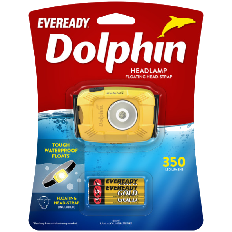 Do more and see more with the Eveready Dolphin DLHD32 Floating LED Headlamp. The Eveready DLHD32 is a bright, durable and waterproof headlamp designed to illuminate your way under demanding weather conditions. This waterproof light features a comfortable head strap with unique floating capabilities for easy recovery if dropped in water. Up to 12X brighter than standard LED technology, it puts off up to 350 lumens of LED light on High, with a beam distance of up to 120m. Switch to Low mode to dim brightness and maximize runtime, and use the pivoting head to directly light exactly where you need it. This hands-free floating light is great as a camping headlamp, fishing light, emergency light for power outages, and more. Built for any adventure, it’s rated IP67 waterproof, can withstand drops up to 3m, and is outfitted with a shatterproof lens. The Eveready Dolphin DOLN6V1 Floating LED Headlamp runs on 3 AAA batteries (included).