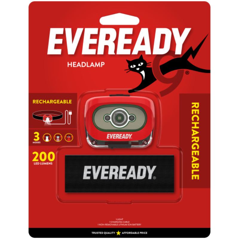 Eveready Value Rechargeable Head Torch Compact, comfortable, dependable, and easy to use, this rechargeable Head Torch is a smart hands-free solution for any indoor or outdoor activity. Its sleek design makes it a great light for outdoor activities and its bright light output is perfect for any indoor OR DIY project. This light has 3 mode options (high, low, red) and comes with a rechargeable battery and a Micro-USB charging cable, it can be recharged directly by a power bank, car charger or other USB power source once it runs out – no need to buy extra batteries. Its durable construction and an adjustable head strap makes it a versatile and dependable option.