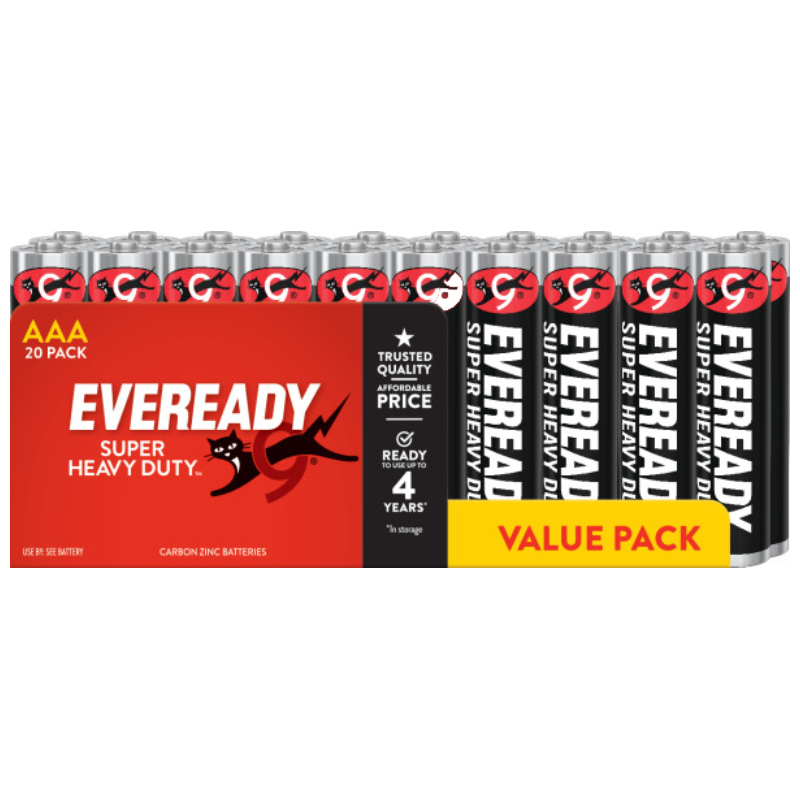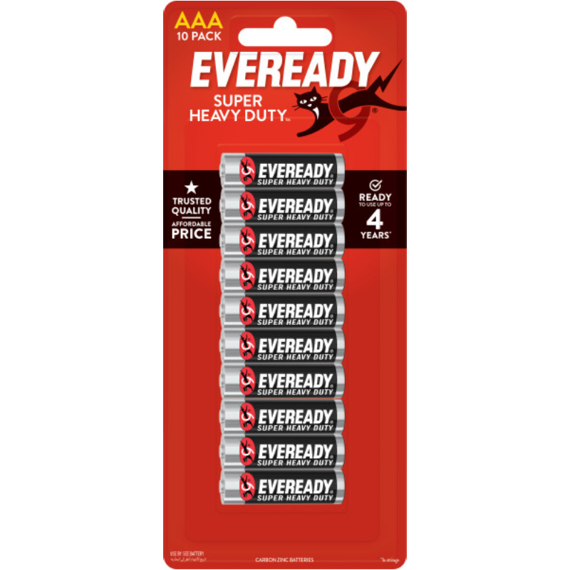 Use Eveready to power your everyday devices. EVEREADY® SUPER HEAVY DUTY™ AAA batteries provided trusted quality at an affordable price. The batteries feature a leak resistant design are ready to use up to 4 years in storage. Use Eveready to power the devices you use each day.