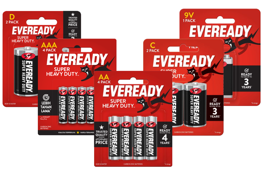 EVEREADY® Super Heavy Duty™ is the affordable Carbon Zinc solution that provides power for you and your family’s basic power needs. EVEREADY® Super Heavy Duty™ brand offers a complete line of AA, AAA, C, D, and 9V lantern batteries and are an economical choice for clocks, flashlights, radios and other devices that are low drain. Since 1896 EVEREADY® batteries have been providing dependable portable power. For every family, everywhere, every day. EVEREADY® for Life.