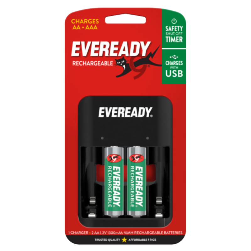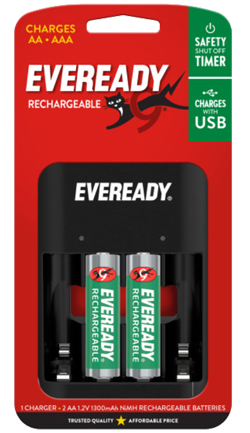 - One Eveready® Recharge Battery Charger for AA and AAA batteries with two Eveready® rechargeable AA batteries and a USB cord for charging