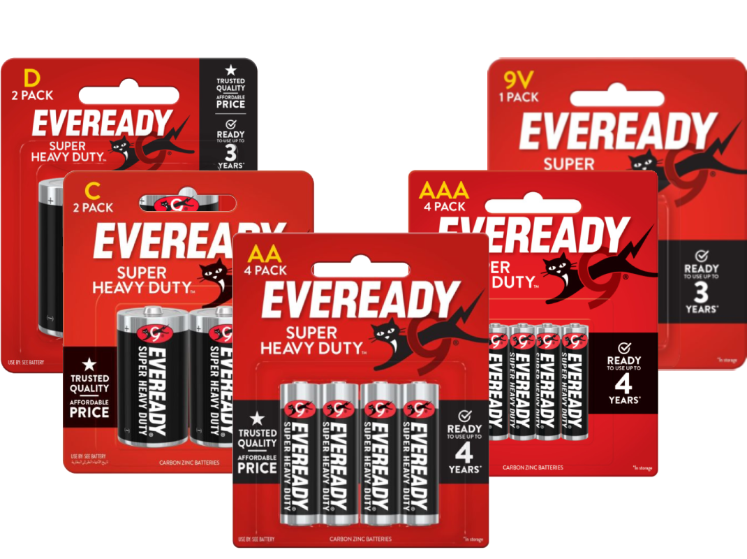 EVEREADY® Super Heavy Duty™ is the affordable Carbon Zinc solution that provides power for you and your family’s basic power needs. EVEREADY® Super Heavy Duty™ brand offers a complete line of AA, AAA, C, D and 9V lantern batteries and are an economical choice for clocks, flashlights, radios and other devices that are low drain. Since 1896 EVEREADY® batteries have been providing dependable portable power. For every family, everywhere, every day. EVEREADY® for Life.