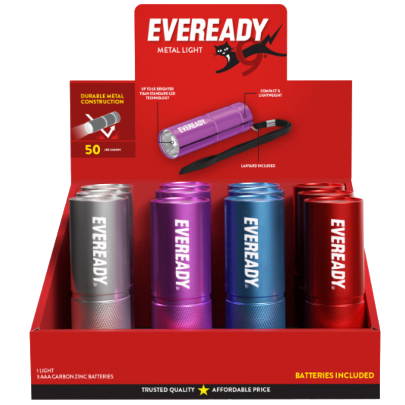 Illuminate your surroundings effortlessly with this high-performance, bright torch. The Eveready® LED Metal Torch provides exceptional brightness for up to 15 hours – whether you’re heading on an adventure or preparing for at-home emergencies. Ideal for camping, DIY, or for power cuts at home, your Eveready® torch is on hand to help you find your way in the dark. This 50-lumen LED light can brighten the darkest of spaces, allowing you to see up to 30 metres away and providing 5x brighter light than standard LED technology. The textured grip body and lanyard attachment make it very easy to hold and use. The Eveready® LED light’s durable metal construction protects against damage, making it ideal for long-lasting use. Keep this lightweight, compact torch in your drawer, car, emergency kit, or toolbox, so you’re always prepared. Eveready® has been powering people’s lives for over 120 years.