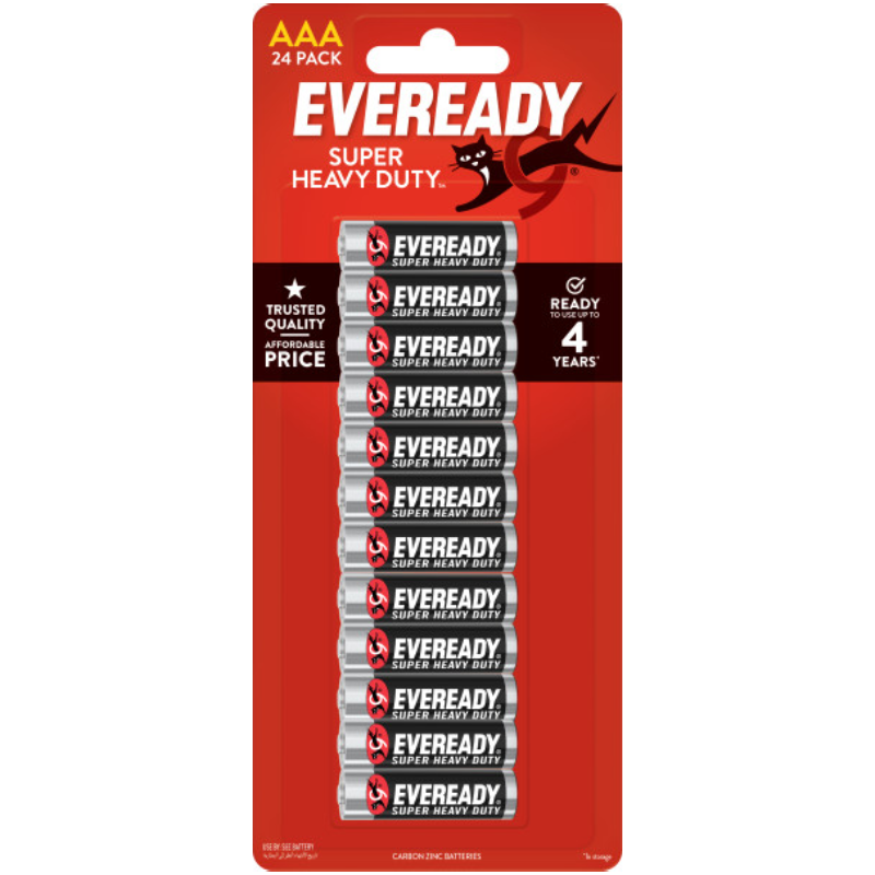 Use Eveready® to power your everyday devices. EVEREADY® SUPER HEAVY DUTY™ AAA batteries provided trusted quality at an affordable price. The batteries feature a leak resistant design are ready to use up to 4 years in storage. Use Eveready® to power the devices you use each day.