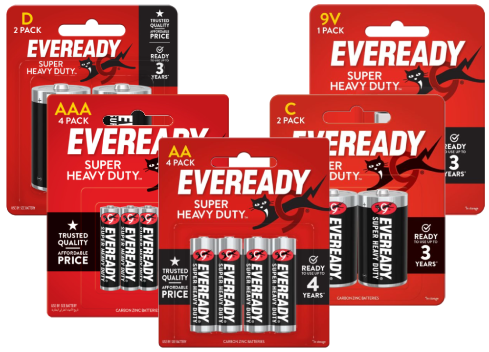 EVEREADY® Super Heavy Duty™ is the affordable Carbon Zinc solution that provides power for you and your family’s basic power needs. EVEREADY® Super Heavy Duty™ brand offers a complete line of AA, AAA, C, D and 9V lantern batteries and are an economical choice for clocks, flashlights, radios and other devices that are low drain. Since 1896 EVEREADY® batteries have been providing dependable portable power. For every family, everywhere, every day. EVEREADY® for Life.