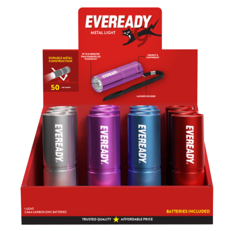 Illuminate your surroundings effortlessly with this high-performance, bright torch. The Eveready LED Metal Torch provides exceptional brightness for up to 15 hours – whether you’re heading on an adventure or preparing for at-home emergencies. Ideal for camping, DIY, or for power cuts at home, your Eveready torch is on hand to help you find your way in the dark. This 50-lumen LED light can brighten the darkest of spaces, allowing you to see up to 30 metres away and providing 5x brighter light than standard LED technology. The textured grip body and lanyard attachment make it very easy to hold and use. The Eveready LED light’s durable metal construction protects against damage, making it ideal for long-lasting use. Keep this lightweight, compact torch in your drawer, car, emergency kit, or toolbox, so you’re always prepared. Eveready has been powering people’s lives for over 120 years.
