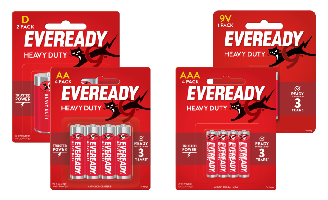Eveready® Heavy Duty Pin cung cấp Nguồn điện đáng tin cậy và sẵn sàng sử dụng lên đến3 năm lưu trữ.