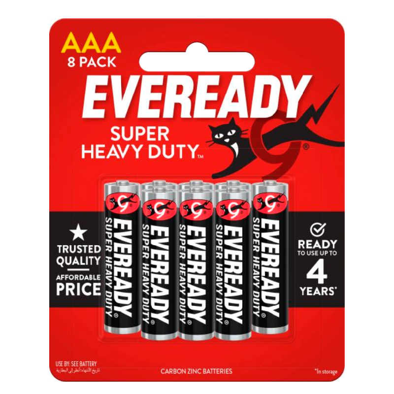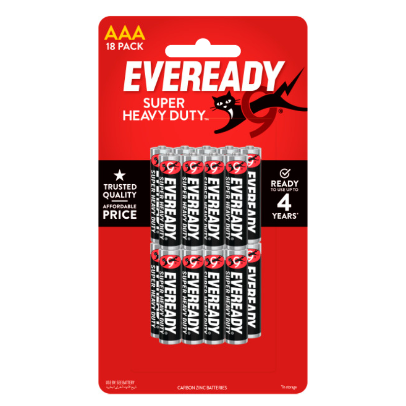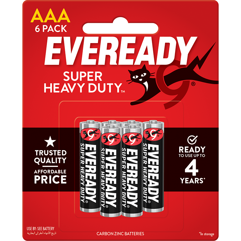 Hãy sử dụng Eveready® để cung cấp năng lượng cho các thiết bị hàng ngày của bạn. Pin AAA Eveready® Super Heavy Duty™ mang đến chất lượng đáng tin cậy với mức giá phải chăng. Pin được trang bị thiết kế chống rò rỉ và sẵn sàng sử dụng sau khi bảo quản đến 4 năm. Hãy sử dụng Eveready® để cung cấp năng lượng cho những thiết bị bạn dùng mỗi ngày.
