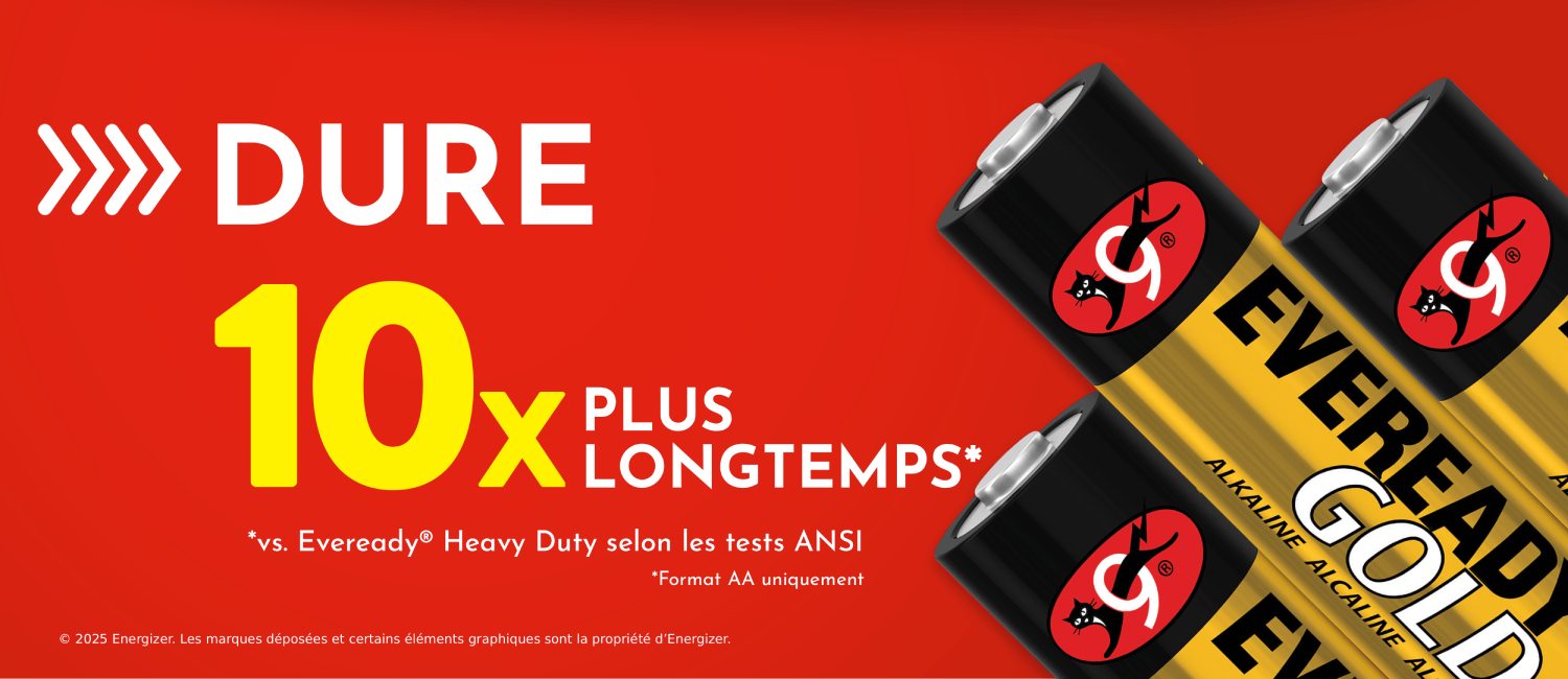 © 2026 Energizer. EVEREADY®, Eveready® GOLD®, le design « Cat & 9 » et certains éléments graphiques sont des marques déposées d’Energizer Brands, LLC et de ses filiales. Toutes les autres marques appartiennent à leurs propriétaires respectifs. Ce site utilise des cookies.