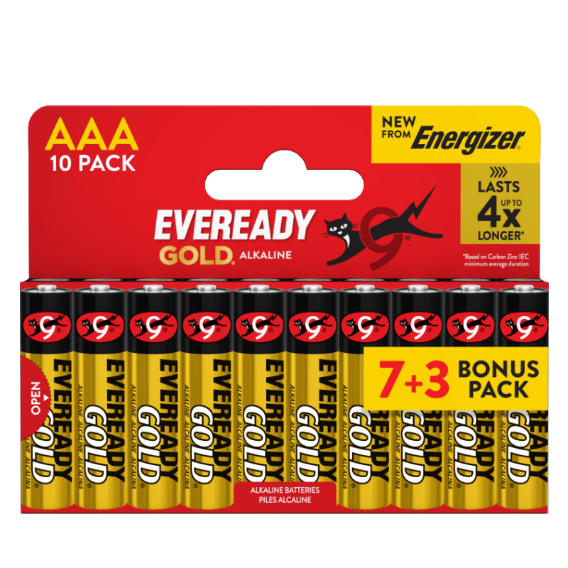 Key Features of Eveready Gold® Batteries: Affordable Power One of the biggest draws of Eveready Gold® batteries is their affordability. Consumers can enjoy reliable battery power without spending too much money, making them a great option for households that need a steady supply of batteries. Long-Lasting Eveready Gold batteries are designed to last even 10x longer than standard zinc-carbon batteries****, providing longer usage times in a range of devices. Moreover, they are ready to use up to 10 years*****! This makes them an excellent option for high-drain devices like toys and portable electronics. Reliable Performance These batteries are designed to deliver consistent and reliable performance throughout their life. Whether you’re using them for low-drain devices like remote controls, clocks, or higher-drain devices like flashlights, portable music players or electronic devices Eveready Gold® batteries can provide dependable power.