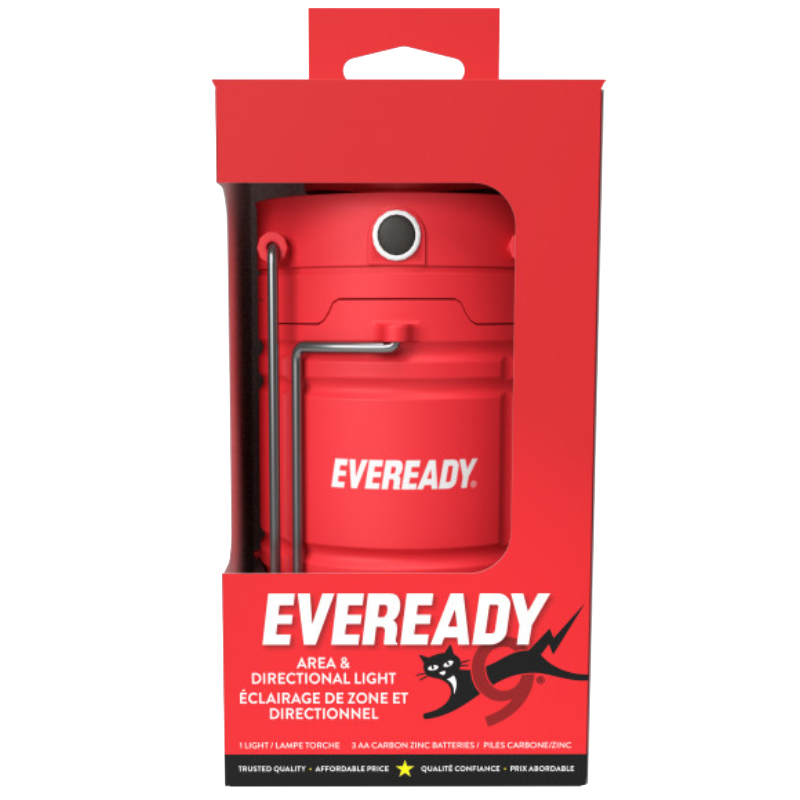 Versatile, compact and convenient, the Eveready Collapsible Hybrid Lantern features both USB charge and battery-power alternatives. This lantern is bright and can be used in a variety of occasions without the stress of running out of batteries again. Just pull up to turn it on and use it as a lantern or use the push button to use the light as a direction light (white light), night vision light (red light), or emergency signaling light (red flashing light). The handles on the top are convenient to carry the light around and they can also be used to lock the light by using the latch on the sides preventing the light from turning on accidentally. The handle on the side can be used with the direction light to turn it into a handheld light. This lantern also has magnets and a hook at the bottom which allows it to be placed in different places.