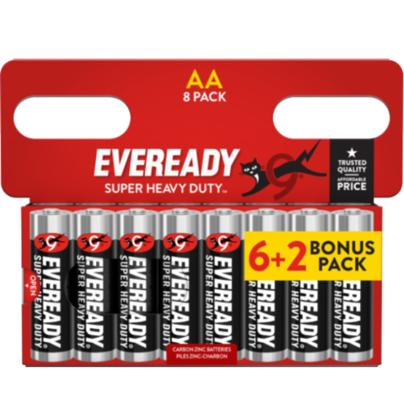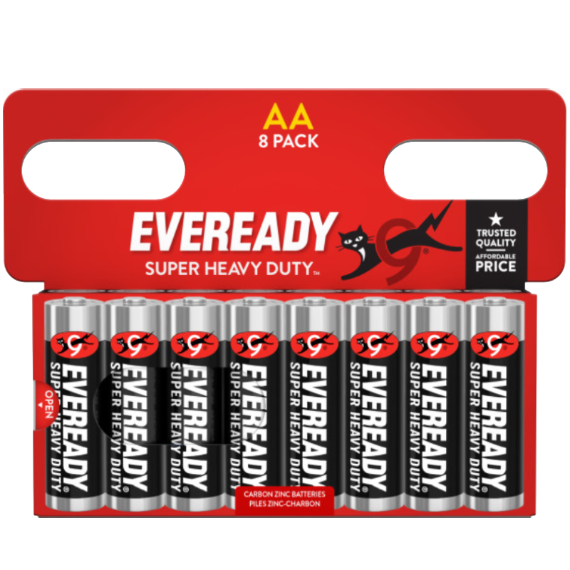 EVEREADY® SUPER HEAVY DUTY™ is the affordable Carbon Zinc solution that provides power for you and your family’s basic power needs. EVEREADY® SUPER HEAVY DUTY™ brand offers a complete line of AA, AAA, C, D and 6V batteries and are an economical choice for clocks, flashlights, radios and other devices that are low drain. Since 1896 EVEREADY® batteries have been providing dependable portable power. For every family, everywhere, every day. EVEREADY® for Life. Features and Benefits Leak Resistance Guaranteed