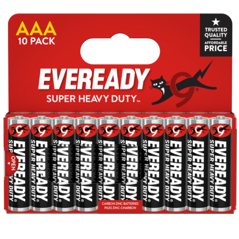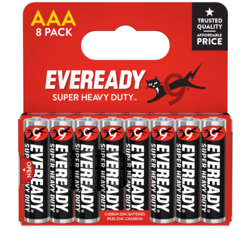 EVEREADY® SUPER HEAVY DUTY™ is the affordable Carbon Zinc solution that provides power for you and your family’s basic power needs. EVEREADY® SUPER HEAVY DUTY™ brand offers a complete line of AA, AAA, C, D and 6V batteries and are an economical choice for clocks, flashlights, radios and other devices that are low drain. Since 1896 EVEREADY® batteries have been providing dependable portable power. For every family, everywhere, every day. EVEREADY® for Life.​ Features and Benefits Leak Resistance Guaranteed