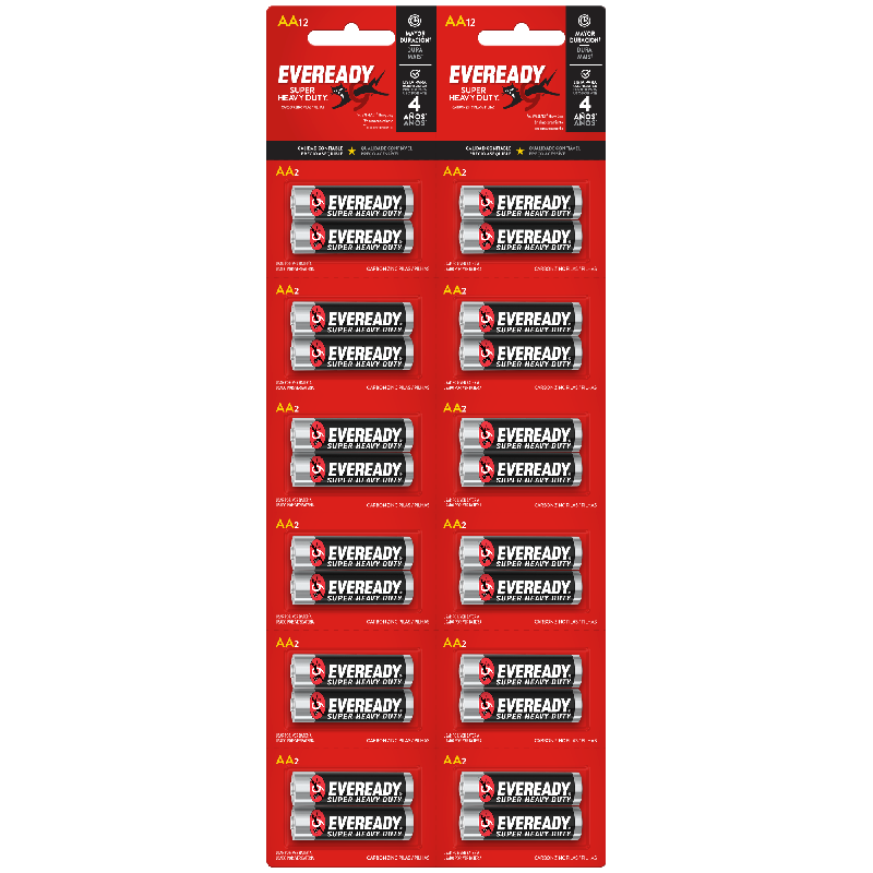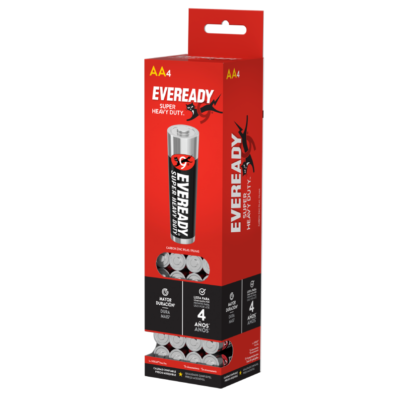 Usa Eveready® para alimentar tus dispositivos de uso diario. Las baterías Eveready® Super Heavy Duty™ AA ofrecen una calidad confiable a un precio accesible. Las baterías cuentan con un diseño resistente a los derrames y están listas para usar hasta por 4 años después de su almacenamiento. Utiliza Eveready® para alimentar los dispositivos que usas cada día.