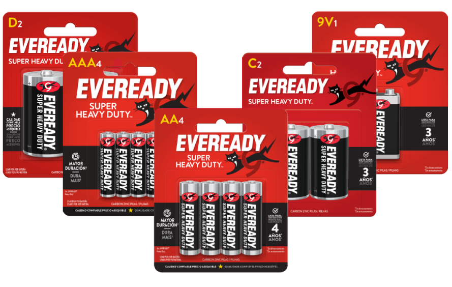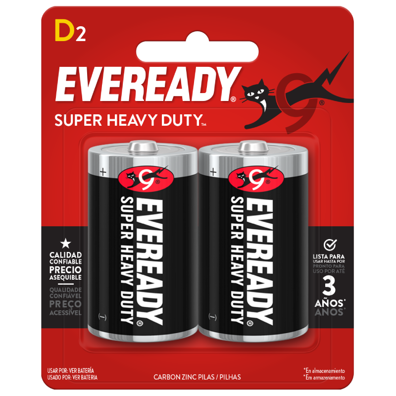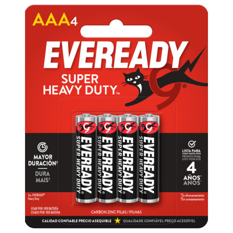 EVEREADY® Super Heavy Duty™ es la solución de Carbon-Zinc económica que brinda energía para las necesidades básicas de tu familia. La línea EVEREADY® Super Heavy Duty™ ofrece una gama completa de pilas AA, AAA, C, D y baterías 9V, siendo una opción accesible para relojes, linternas, radios y otros dispositivos de bajo consumo. Desde 1896, las baterías EVEREADY® han proporcionado energía portátil confiable. Para cada familia, en cualquier lugar, todos los días. EVEREADY® para toda la vida.
