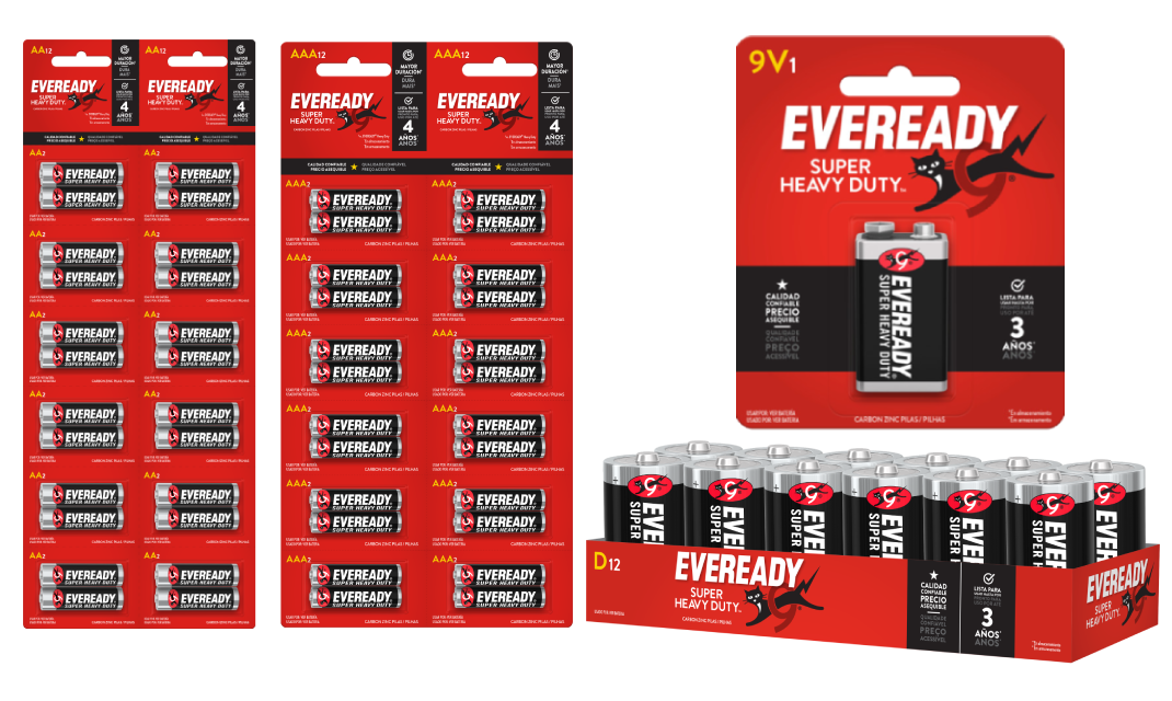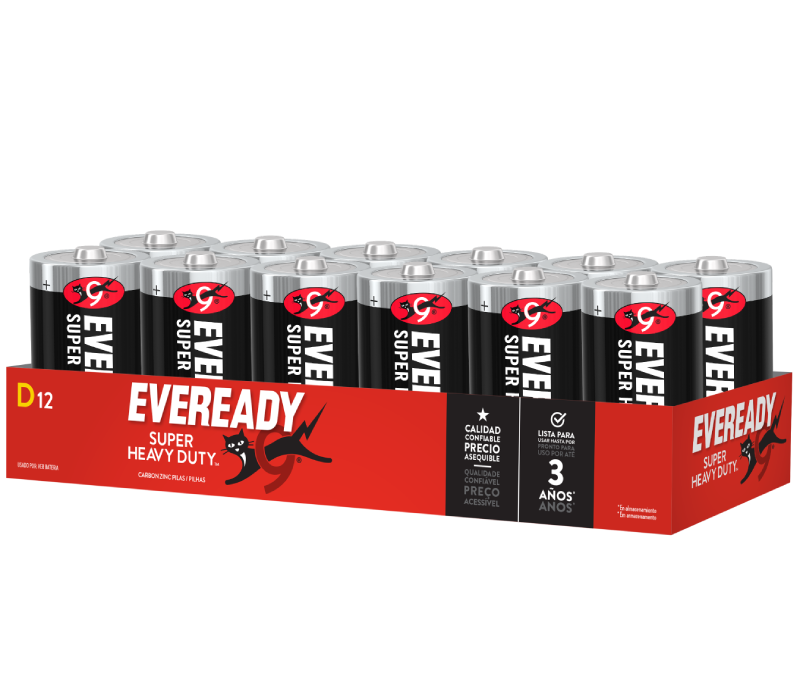 EVEREADY® Super Heavy Duty™ es la solución de Carbon-Zinc económica que brinda energía para las necesidades básicas de tu familia. La línea EVEREADY® Super Heavy Duty™ ofrece una gama completa de pilas AA, AAA, D y baterías 9V, siendo una opción accesible para relojes, linternas, radios y otros dispositivos de bajo consumo. Desde 1896, las baterías EVEREADY® han proporcionado energía portátil confiable. Para cada familia, en cualquier lugar, todos los días. EVEREADY® para toda la vida.