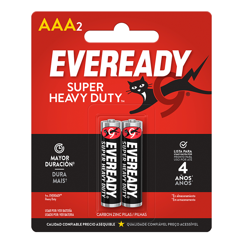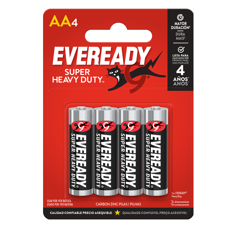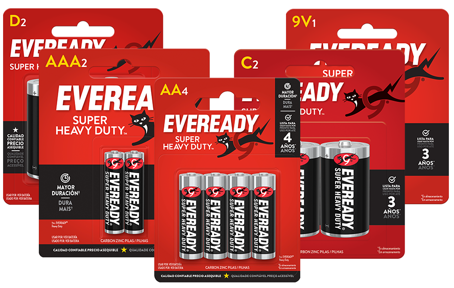 EVEREADY® Super Heavy Duty™ es la solución value de zinc-carbón que brinda energía para las necesidades básicas de tu familia. La marca EVEREADY® Super Heavy Duty™ ofrece una línea completa de Pilas AA, AAA, C, D y de linterna de 9V, siendo una opción accesible para relojes, linternas, radios y otros dispositivos de bajo consumo. Desde 1896, las Pilas EVEREADY® han proporcionado energía portátil confiable. Para cada familia, en cualquier lugar, todos los días. EVEREADY® para la vida.