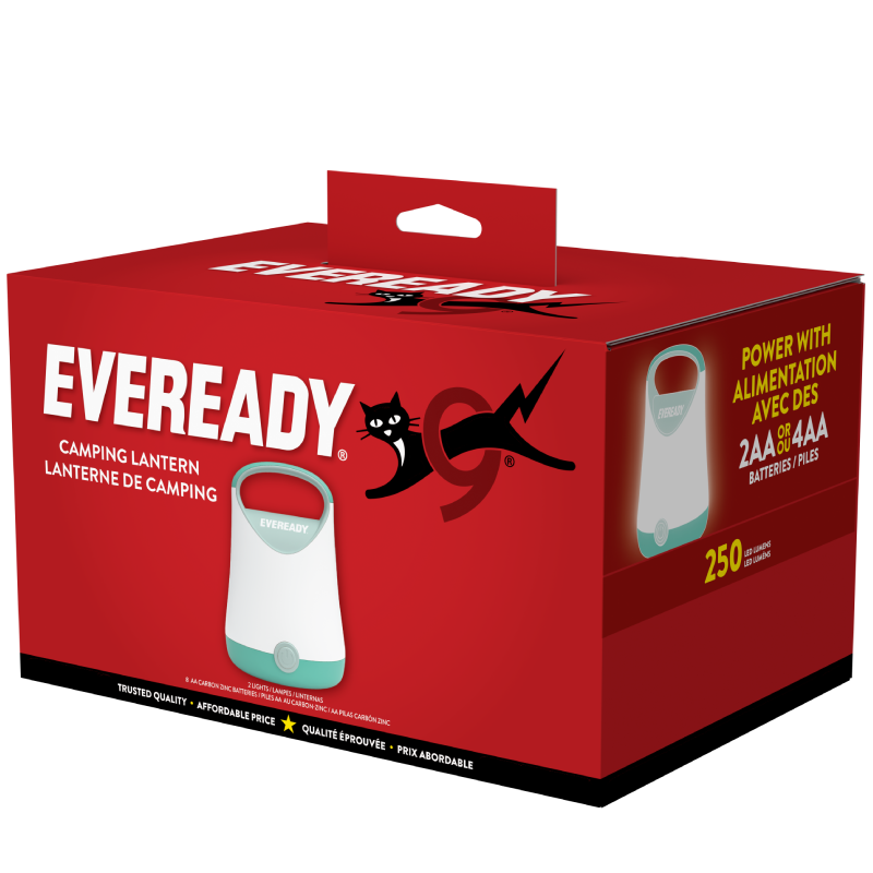 Get bright, reliable light in a compact design with this 2-pack of Eveready GPAL411 Compact LED Lanterns. The Eveready GPAL411 is a small lantern featuring the latest in LED light technology and an exceptional runtime, putting off up to 250 lumens* of bright, 360-degree area light for up to 50hrs with 4AA Carbon Zinc.** This convenient portable lantern has a top handle for easy carrying and is great as a camping lantern, an emergency light for power outages, and more. With this 2-pack, you can keep one lantern in the house and one in the garage, or give them as practical gifts to family and friends. The Eveready GPAL411 is a battery operated lantern with ReadyFlex technology for enhanced power saving; it can run on 2 AA or 4 AA batteries. Built for any adventure, this durable LED lantern is rated IPX4 water resistant and can withstand drops up to 1m.