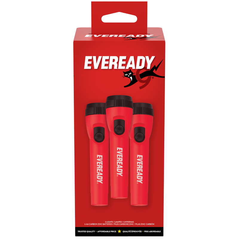 Ensure you’re always prepared with this 3-pack of Eveready LC1L2A1 Handheld Flashlights, offering bright light and reliable visibility in almost any situation. Each Eveready flashlight boasts an impressive 30-hour runtime to provide long-lasting brightness for adventures and emergencies. The easy-to-use design allows for hassle-free operation, while the included wrist strap allows for easy carrying. Whether you’re camping, hiking, or dealing with a power outage, these flashlights are a dependable lighting solution. With this 3-pack, you can keep one handheld flashlight upstairs, one in the basement, and one in the garage, or give them as practical gifts to family and friends. The Eveready LC1L2A1 is a battery powered flashlight that runs on two AA batteries. This flashlight multipack comes with a total of six Eveready AA batteries so you can power all three lights upon opening.