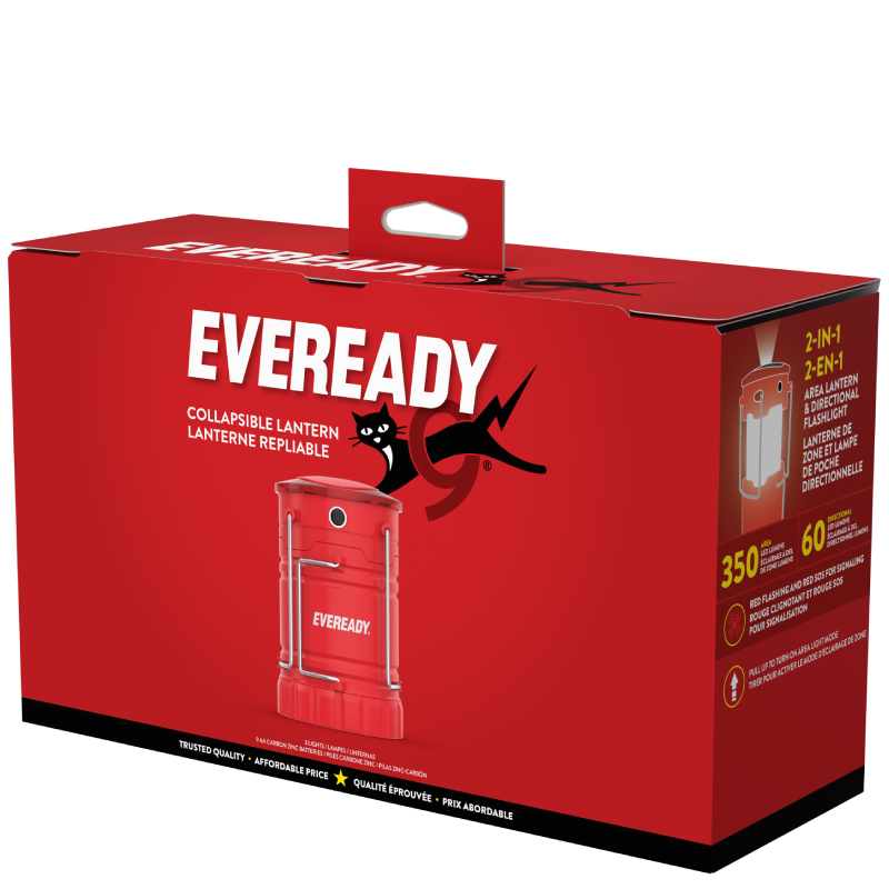 Get bright, reliable light in a compact design with this 3-pack of Eveready ALCL31 Collapsible LED Lanterns. The Eveready ALCL31 collapsible lantern features four LED light modes: Area and Directional, plus Red Flashing and Red SOS for emergencies. Up to 4X brighter than standard LED technology, it puts off up to 350 lumens of bright, 360-degree area light in Area mode. Simply unlatch the handles and pull up on the lantern to turn it on in Area mode. When not in use, the latching handles prevent the light from turning on accidentally, preserving the life of your batteries. To use the lantern as a handheld flashlight, push the button to change to Directional mode and use the side handle to carry. In Directional mode, it puts off up to 60 lumens of light, with a beam distance of up to 100m. This convenient portable lantern features top handles for easy carrying, a hook for hanging, and magnets on the bottom for placement in different areas. It’s great as a camping lantern, an emergency light for power outages, and more. With this 3-pack, you can keep one lantern upstairs, one in the basement, and one in the garage, or give them as practical gifts to family and friends. The Eveready ALCL31 is a battery operated lantern that runs on 3 AA batteries.
